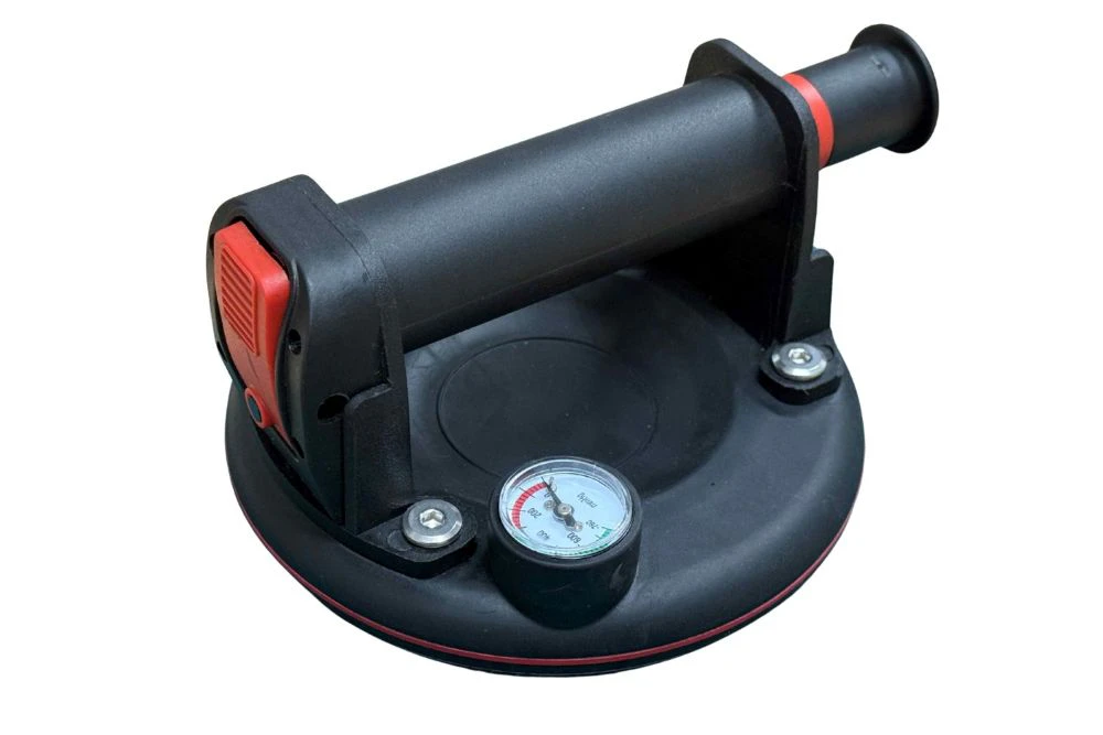 ガラスやタイル、金属板など平らで表面が滑らかな物を持ち運ぶ際に便利なサクションリフター。真空ゲージが付いており、吸着状態を目視で確認できるため、吸着力不足による不用意な脱落を未然に防ぐ。