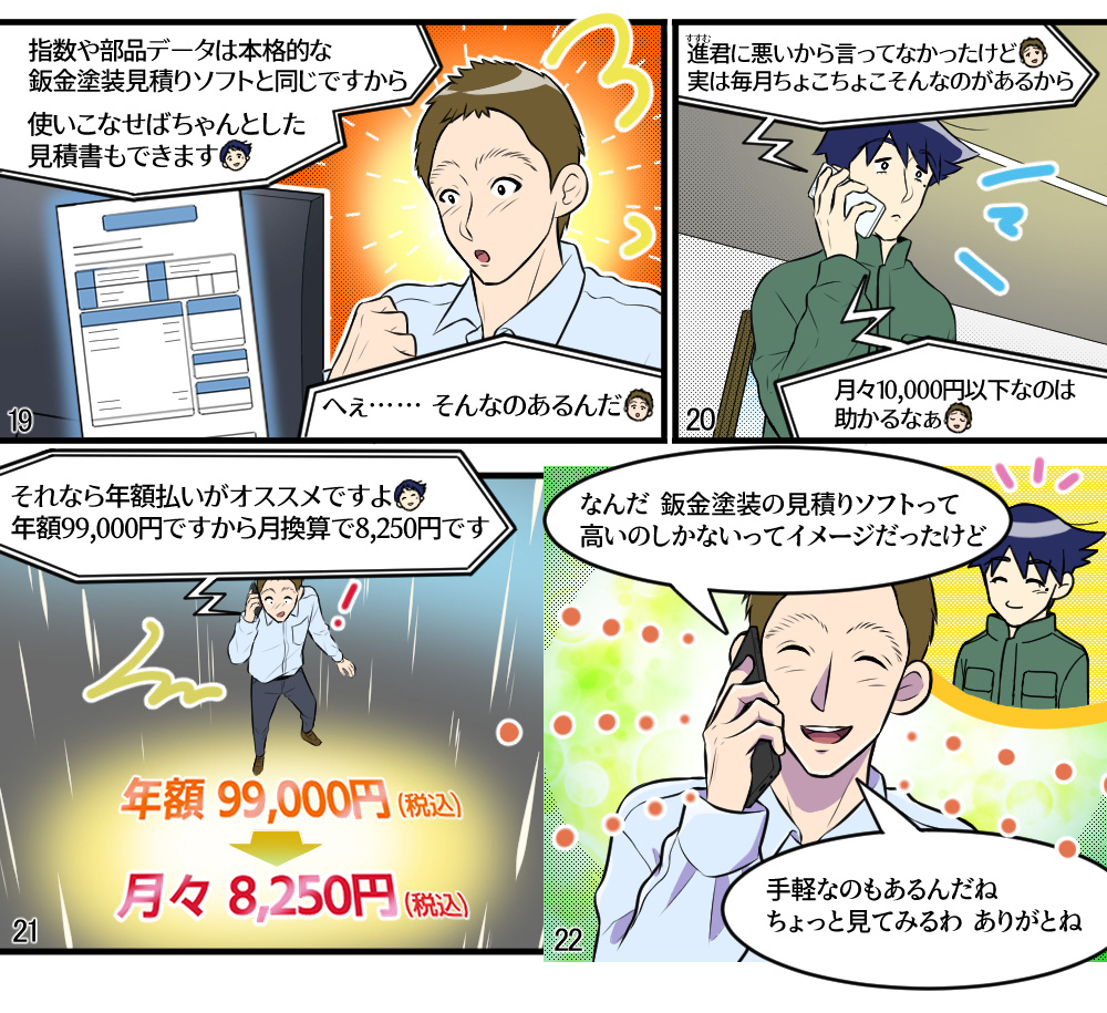 本稿は鈑金塗装業界に身を投じ、現場の作業を一通り知っている主人公らの視点から事故車見積りを学ぶ、実際の現場経験に則した物語である。