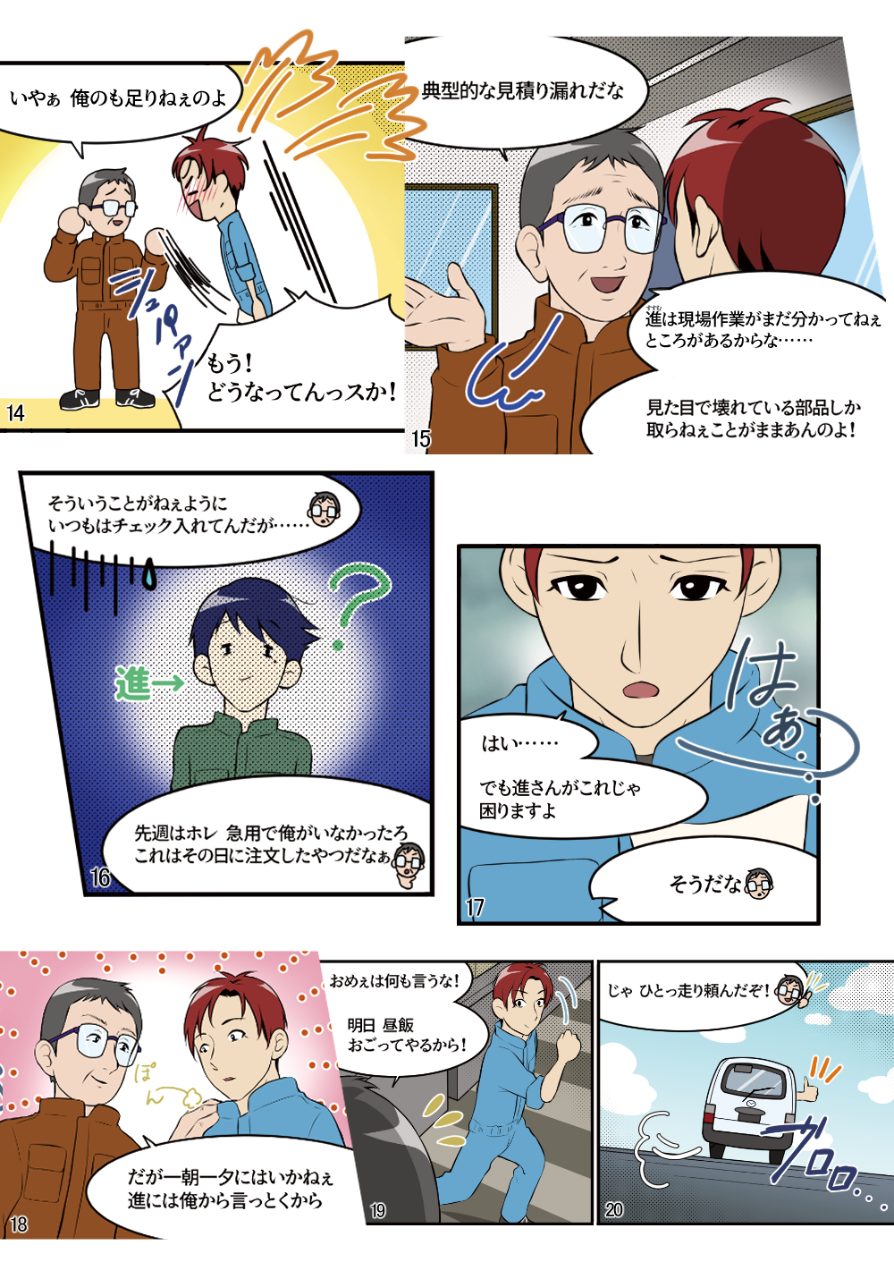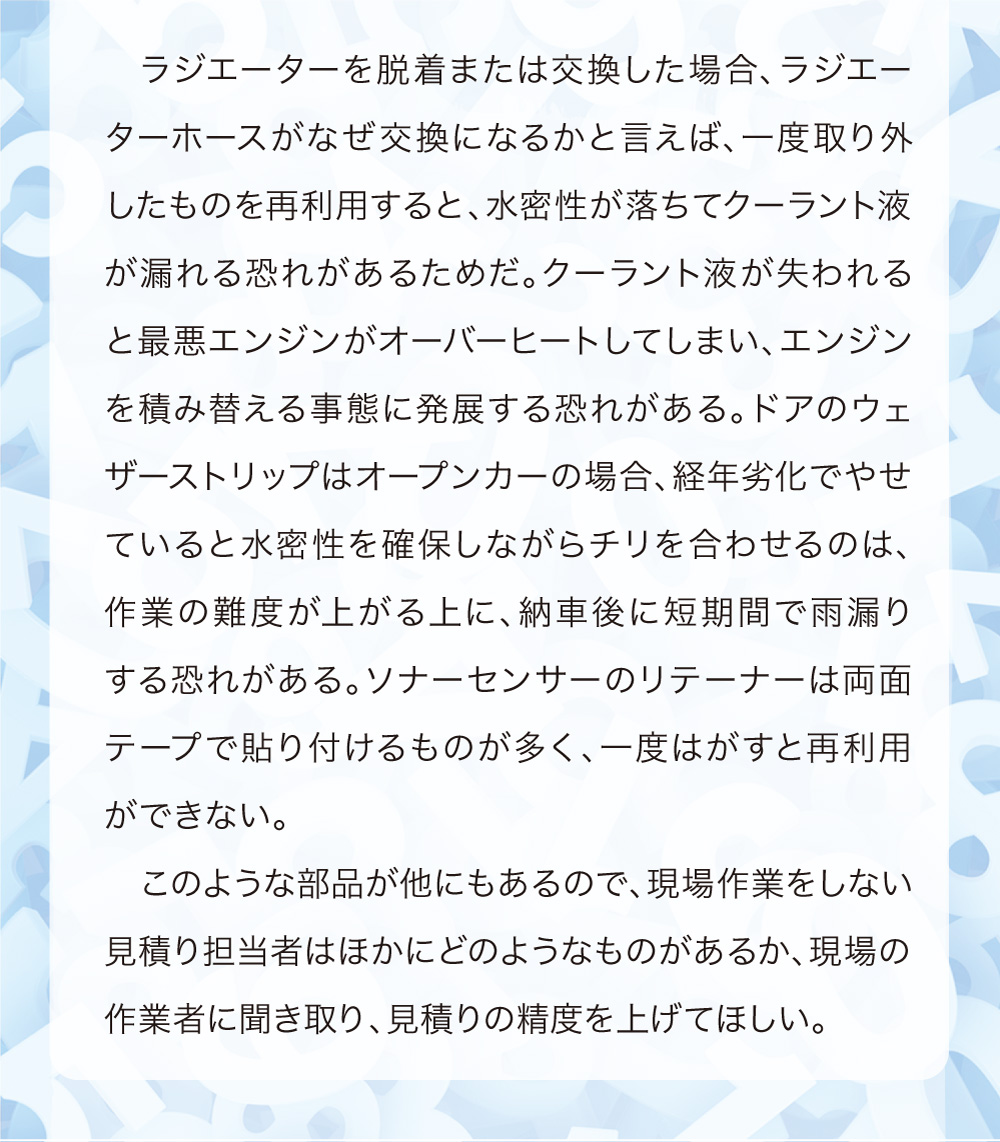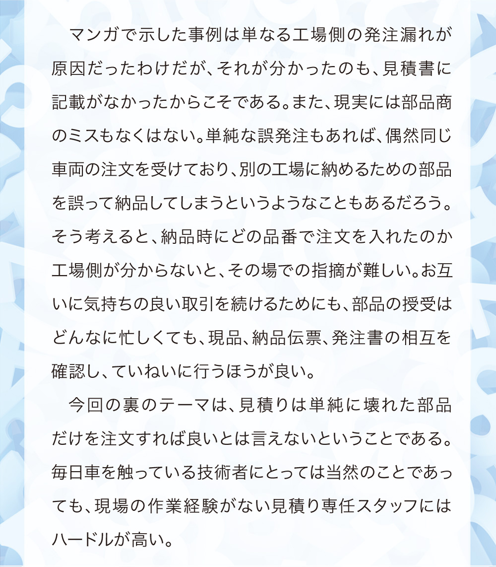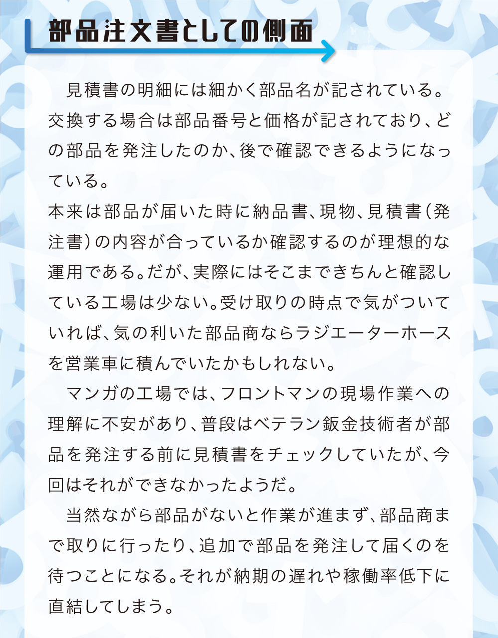 本稿は鈑金塗装業界に身を投じ、現場の作業を一通り知っている主人公らの視点から事故車見積りを学ぶ、実際の現場経験に則した物語である。