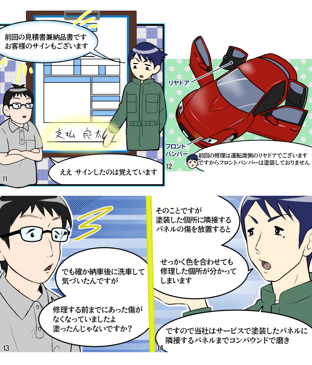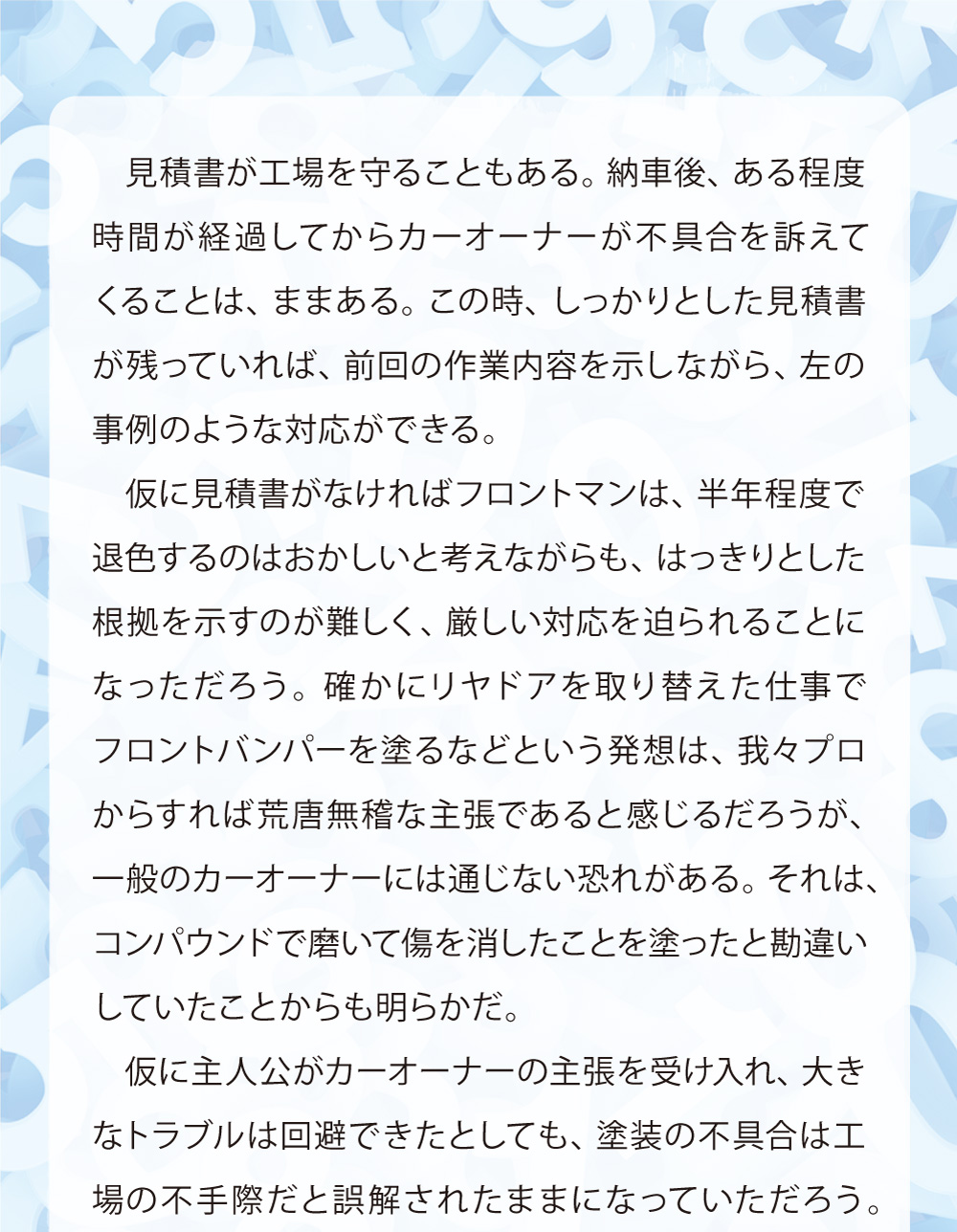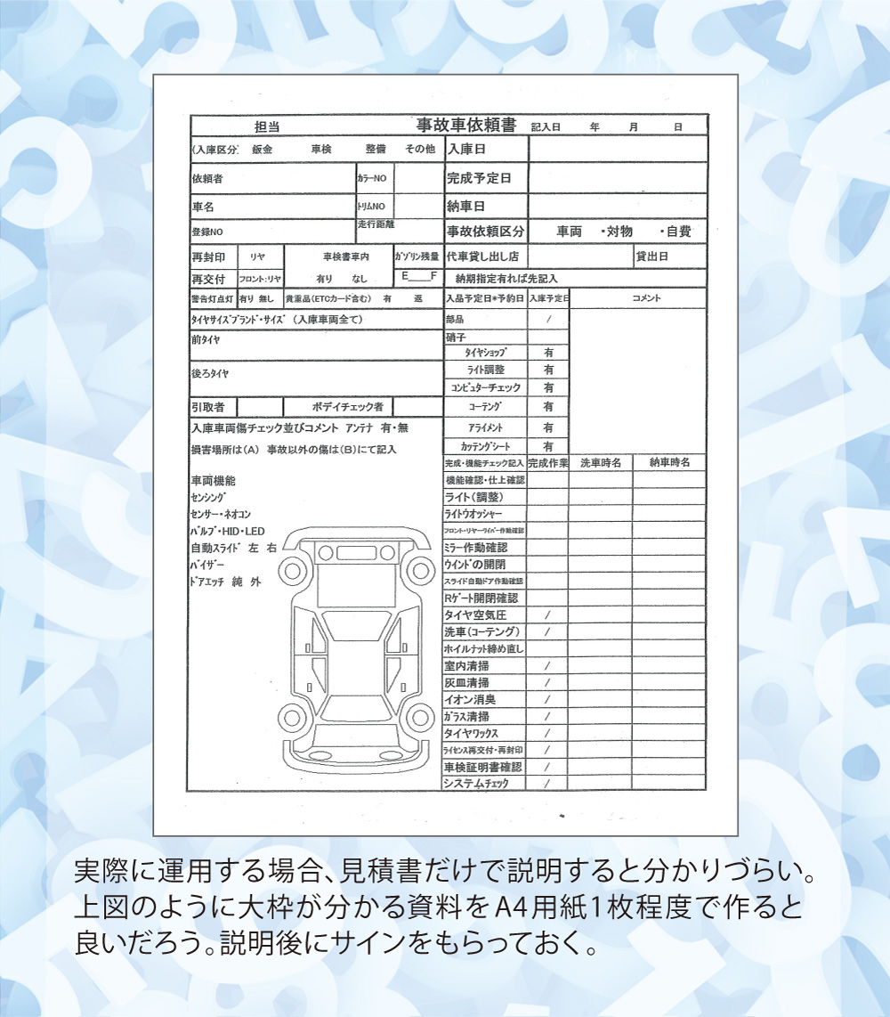 本稿は鈑金塗装業界に身を投じ、現場の作業を一通り知っている主人公らの視点から事故車見積りを学ぶ、実際の現場経験に則した物語である。