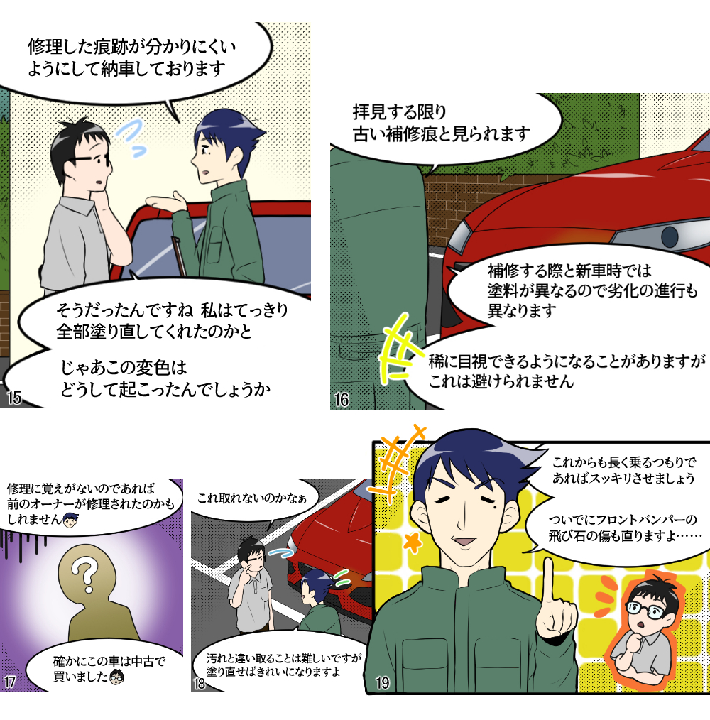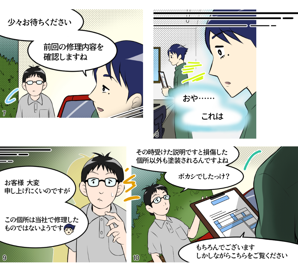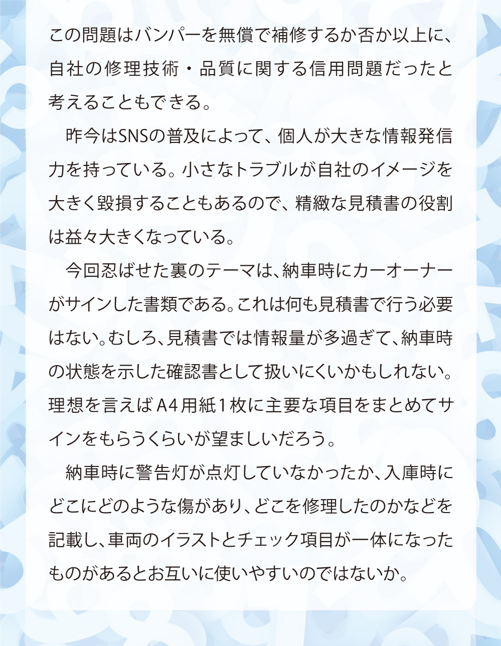 本稿は鈑金塗装業界に身を投じ、現場の作業を一通り知っている主人公らの視点から事故車見積りを学ぶ、実際の現場経験に則した物語である。