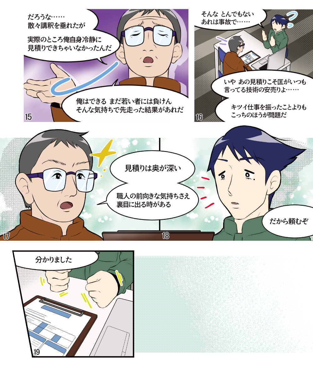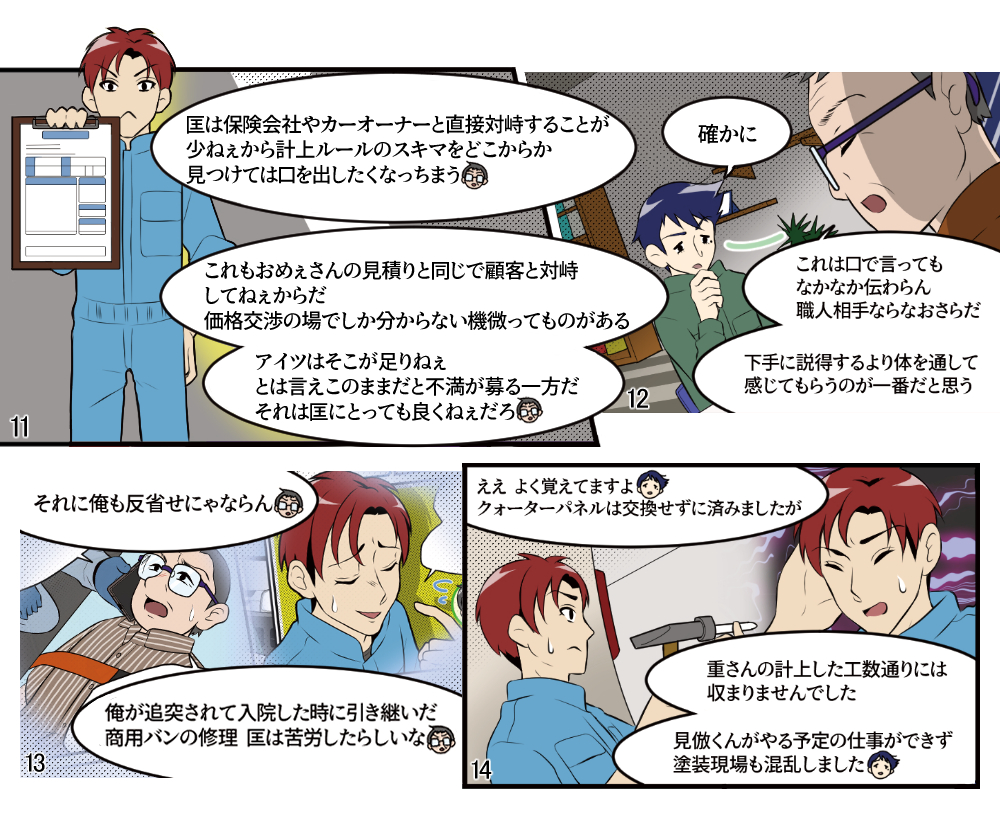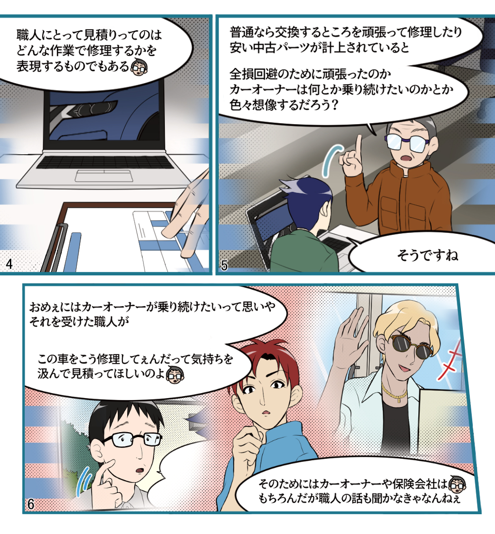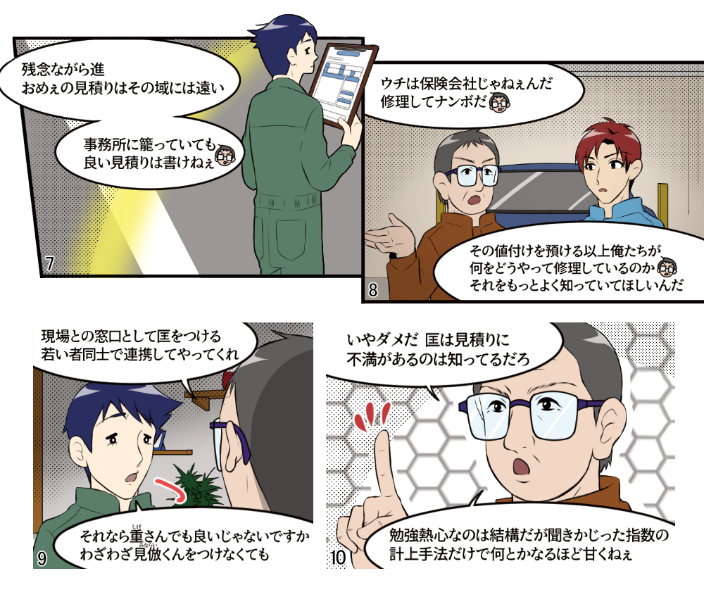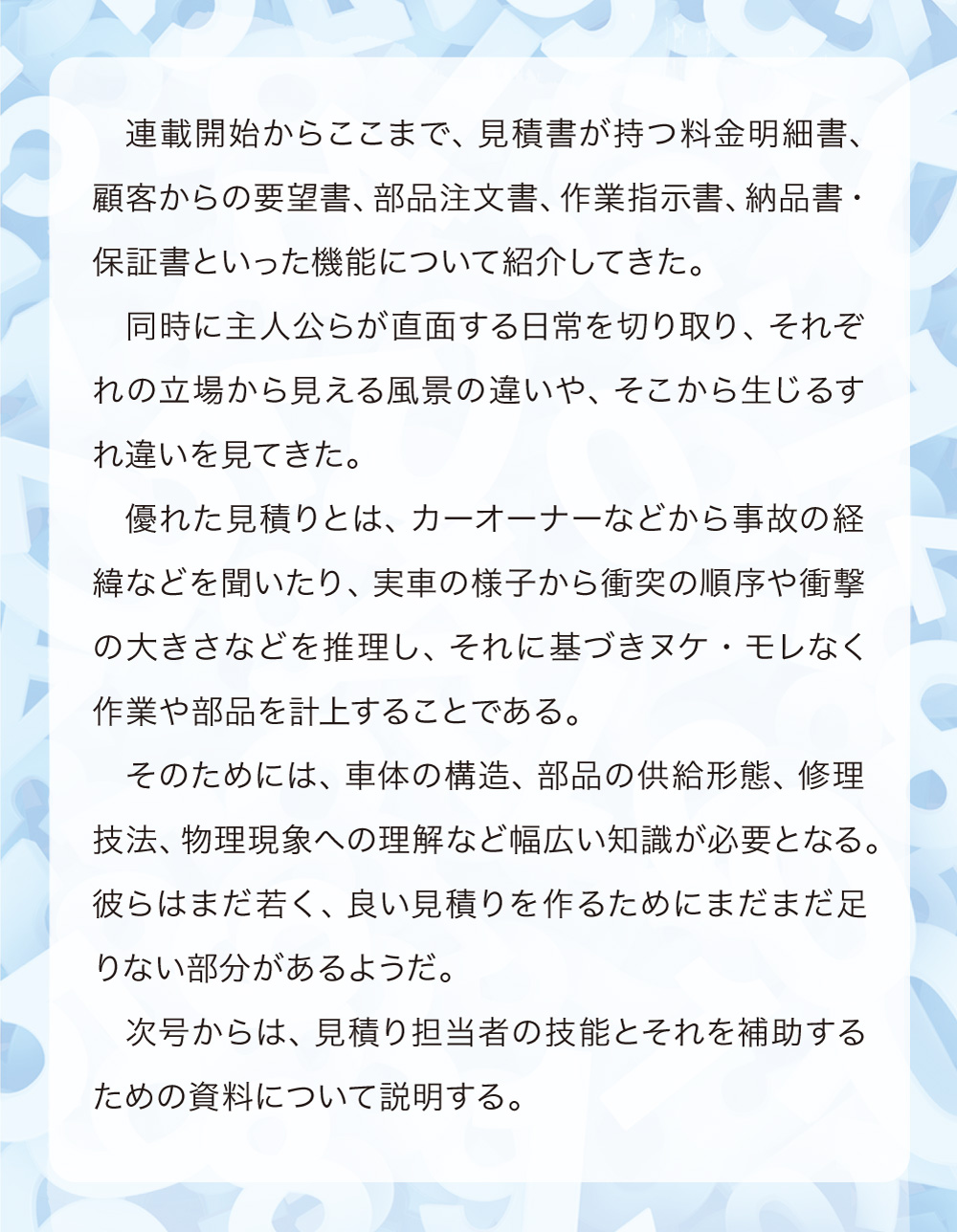 本稿は鈑金塗装業界に身を投じ、現場の作業を一通り知っている主人公らの視点から事故車見積りを学ぶ、実際の現場経験に則した物語である。