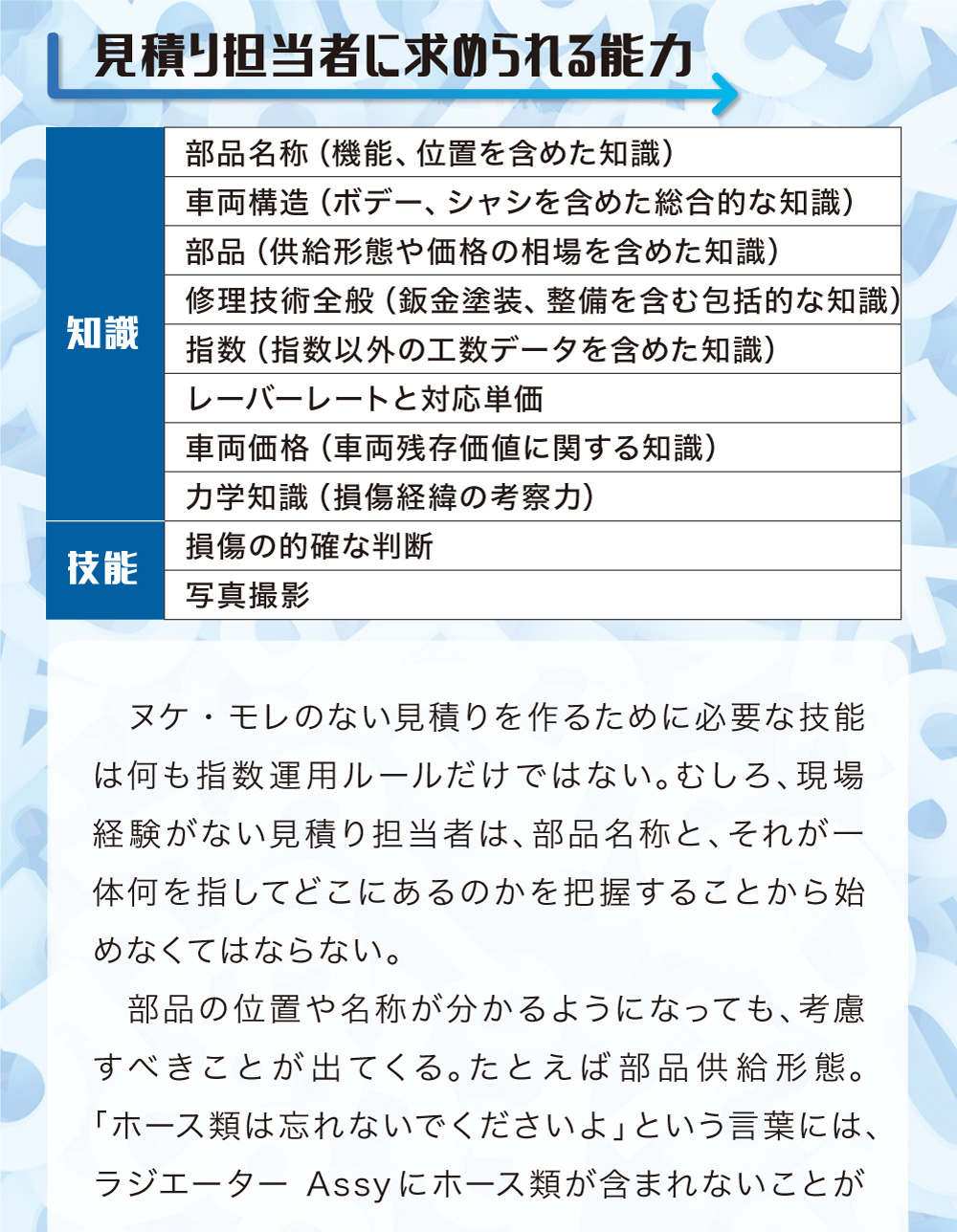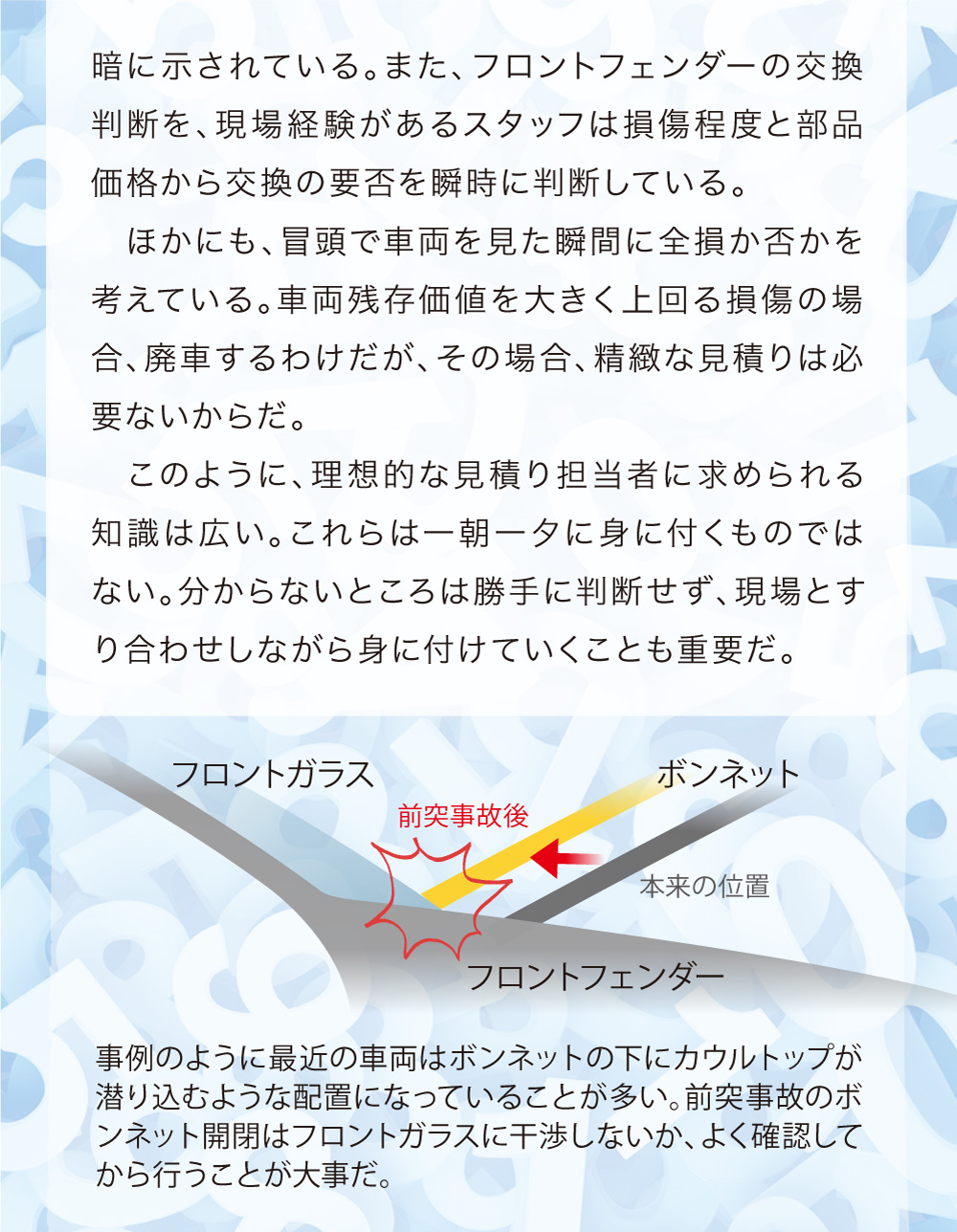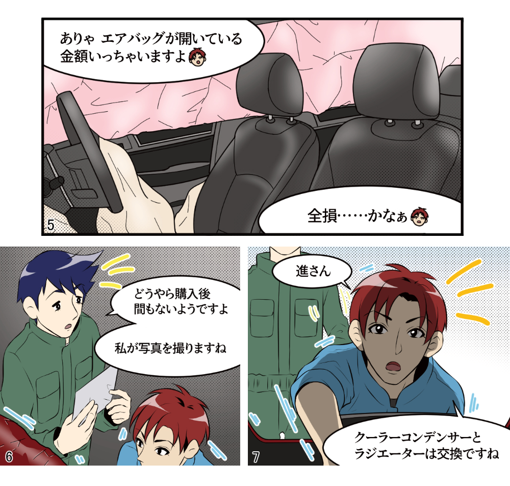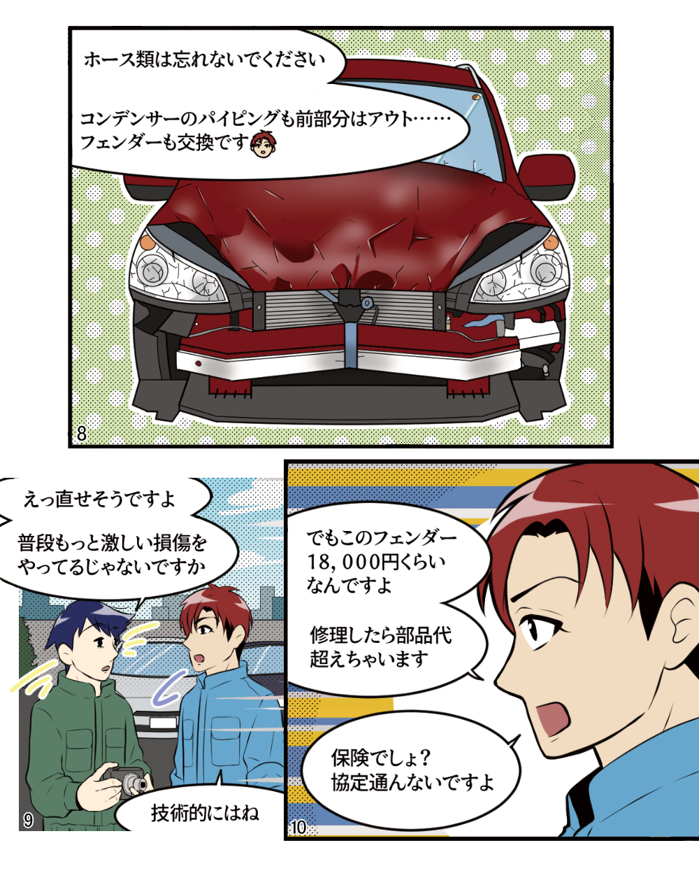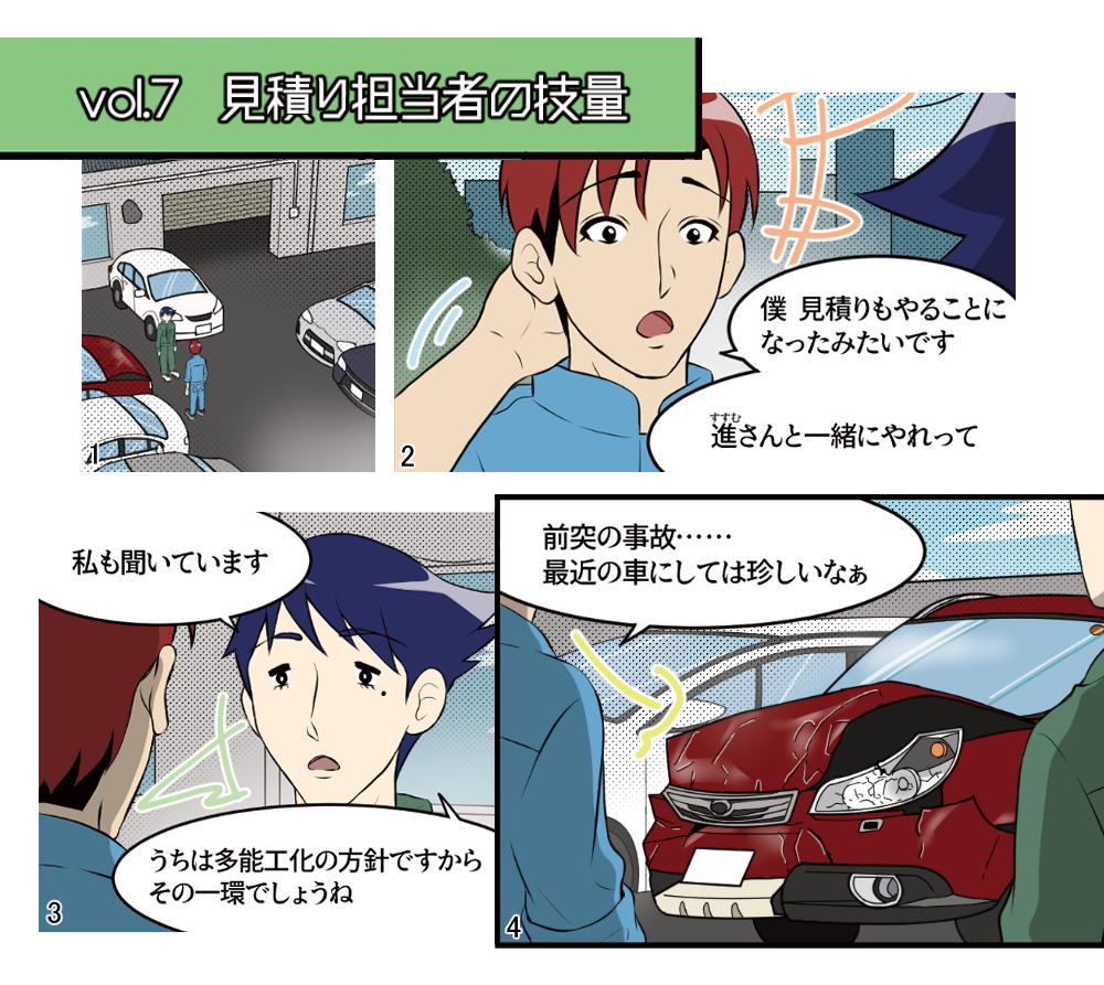 本稿は鈑金塗装業界に身を投じ、現場の作業を一通り知っている主人公らの視点から事故車見積りを学ぶ、実際の現場経験に則した物語である。