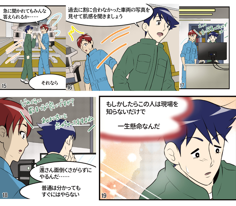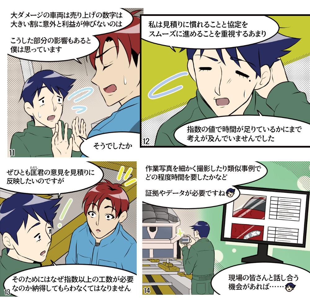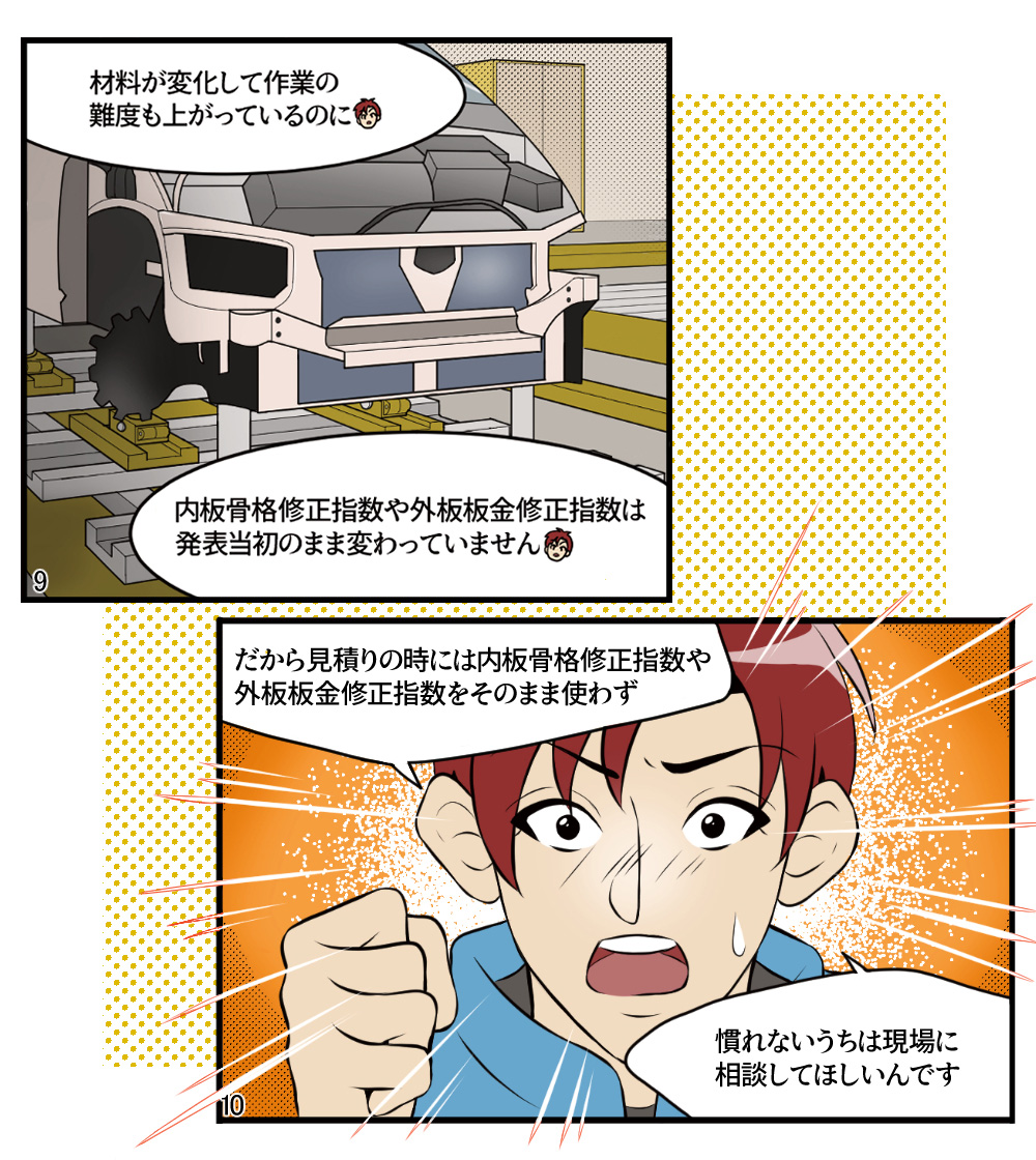 本稿は鈑金塗装業界に身を投じ、現場の作業を一通り知っている主人公らの視点から事故車見積りを学ぶ、実際の現場経験に則した物語である。