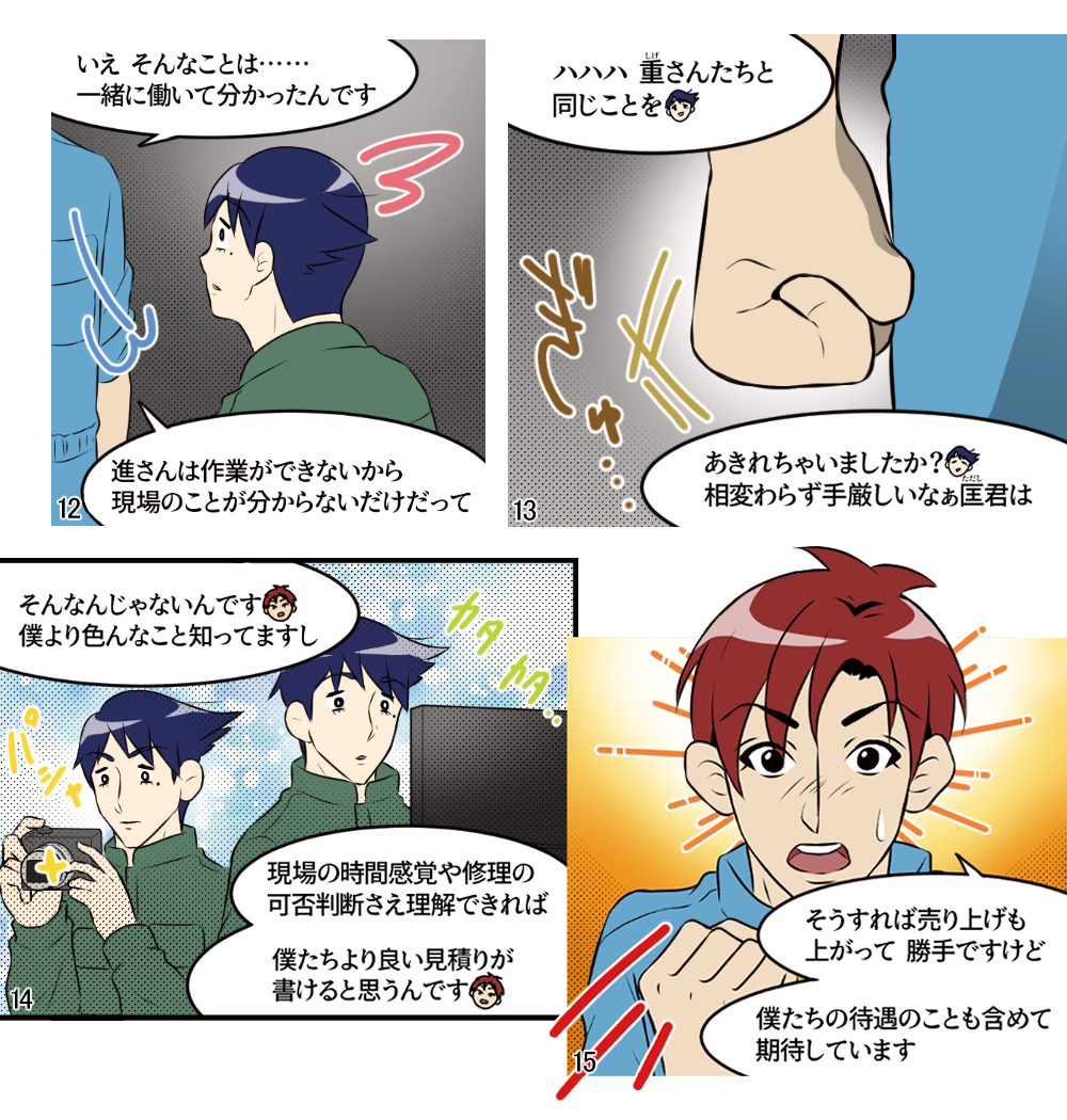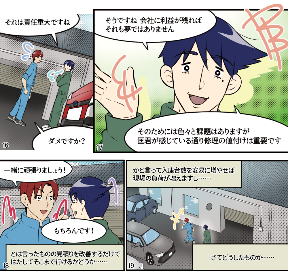 本稿は鈑金塗装業界に身を投じ、現場の作業を一通り知っている主人公らの視点から事故車見積りを学ぶ、実際の現場経験に則した物語である。