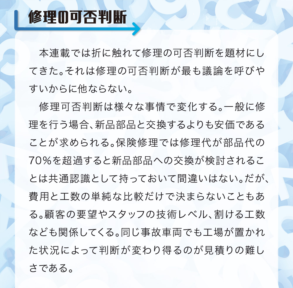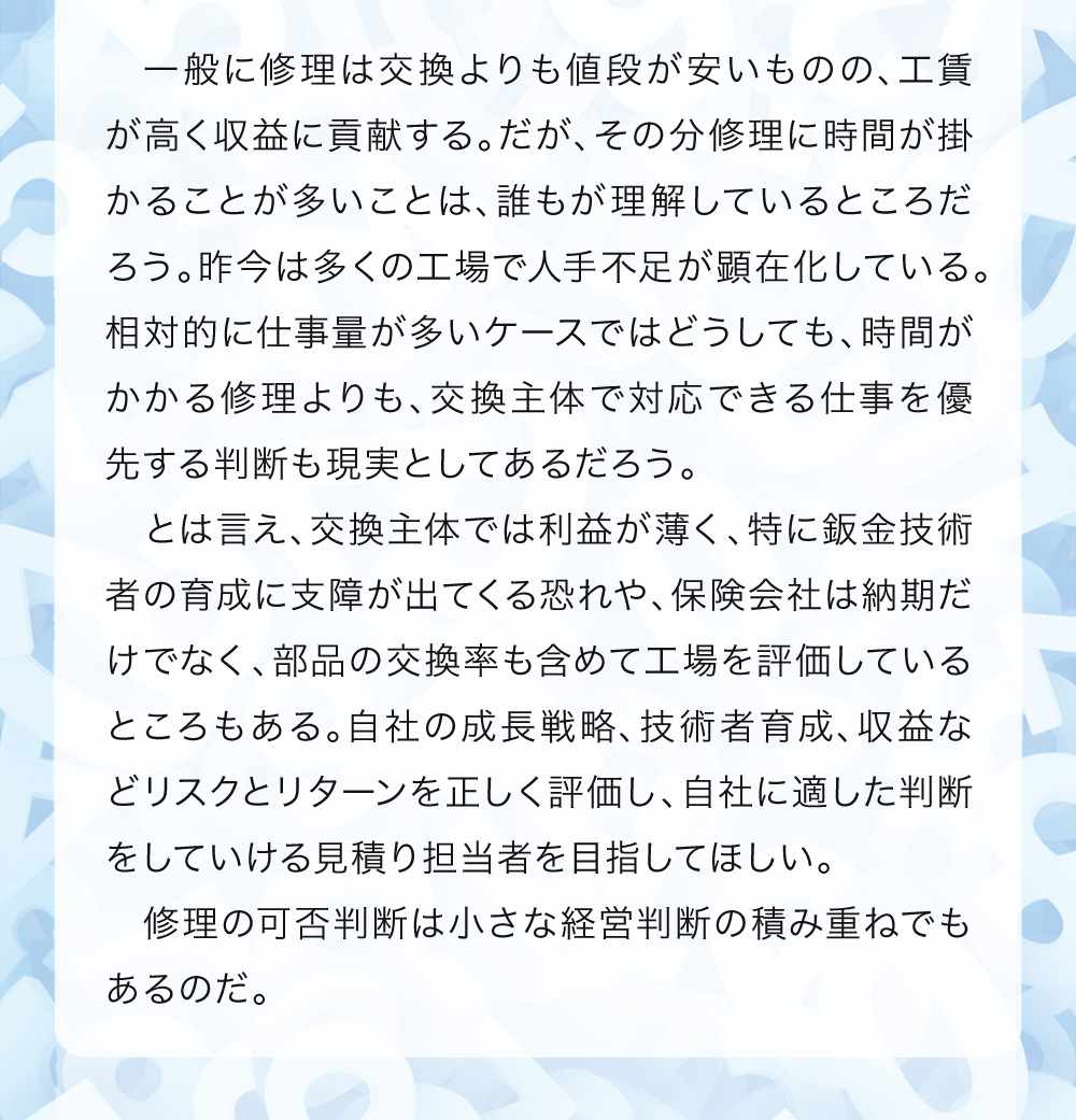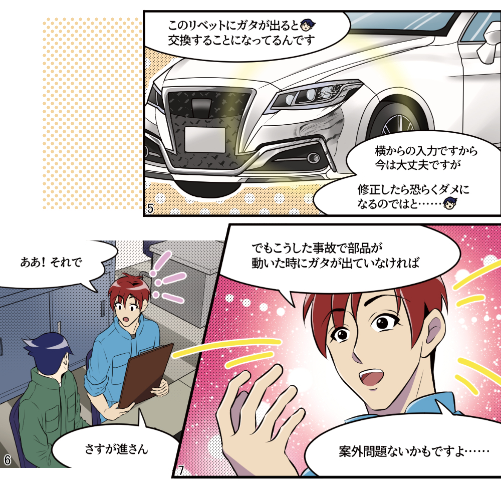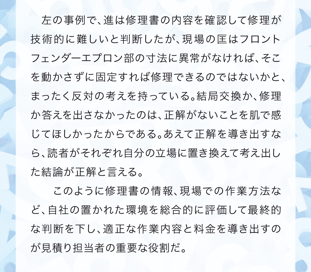 本稿は鈑金塗装業界に身を投じ、現場の作業を一通り知っている主人公らの視点から事故車見積りを学ぶ、実際の現場経験に則した物語である。