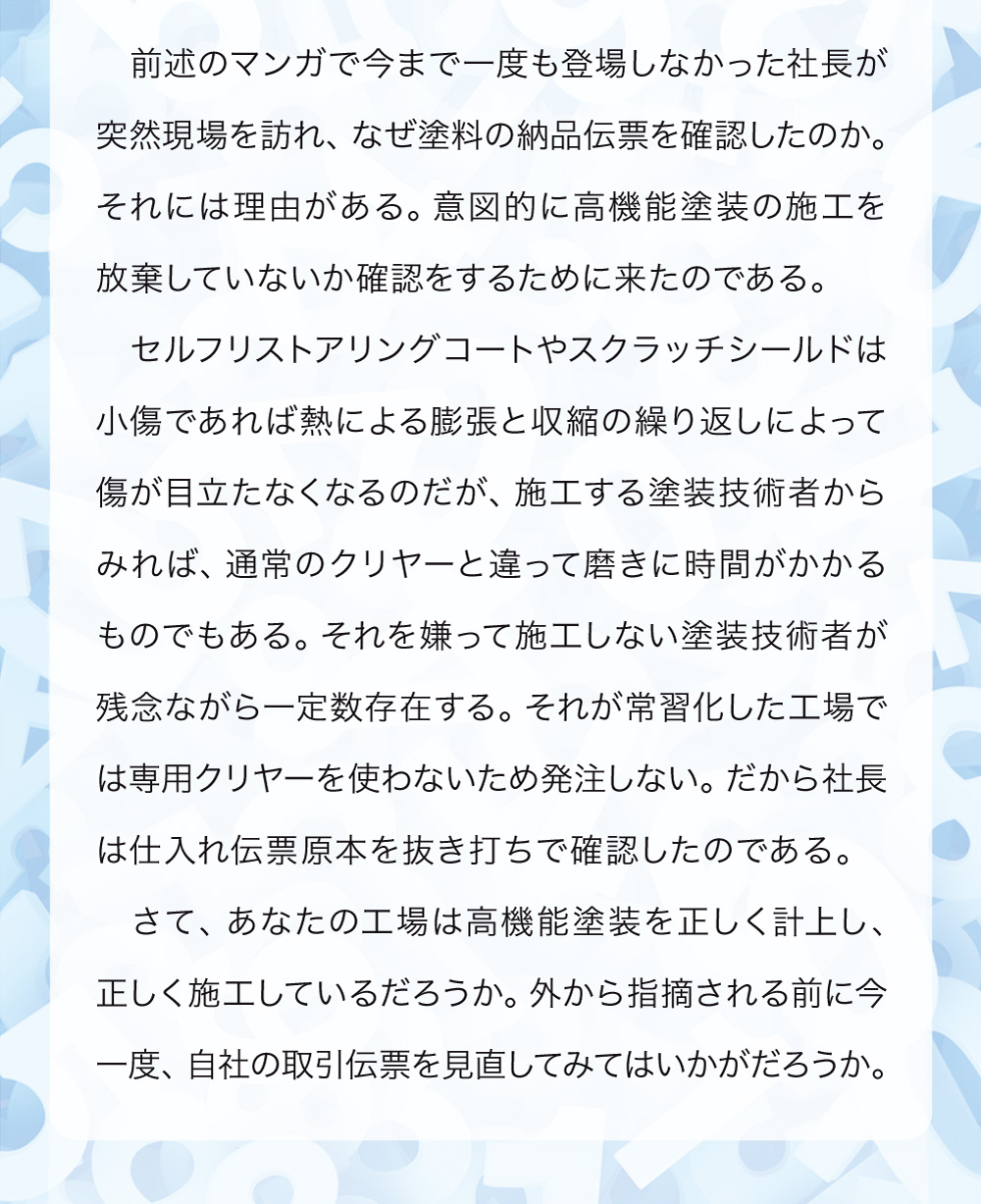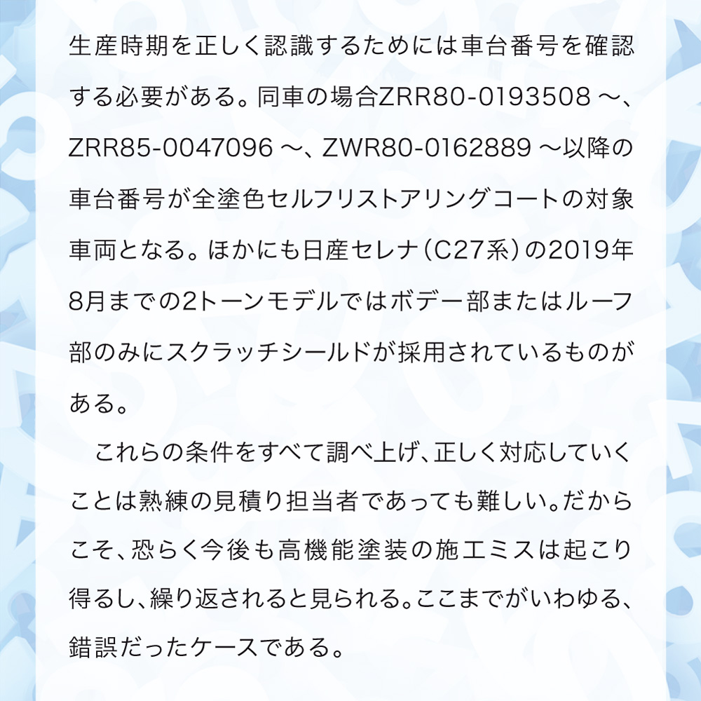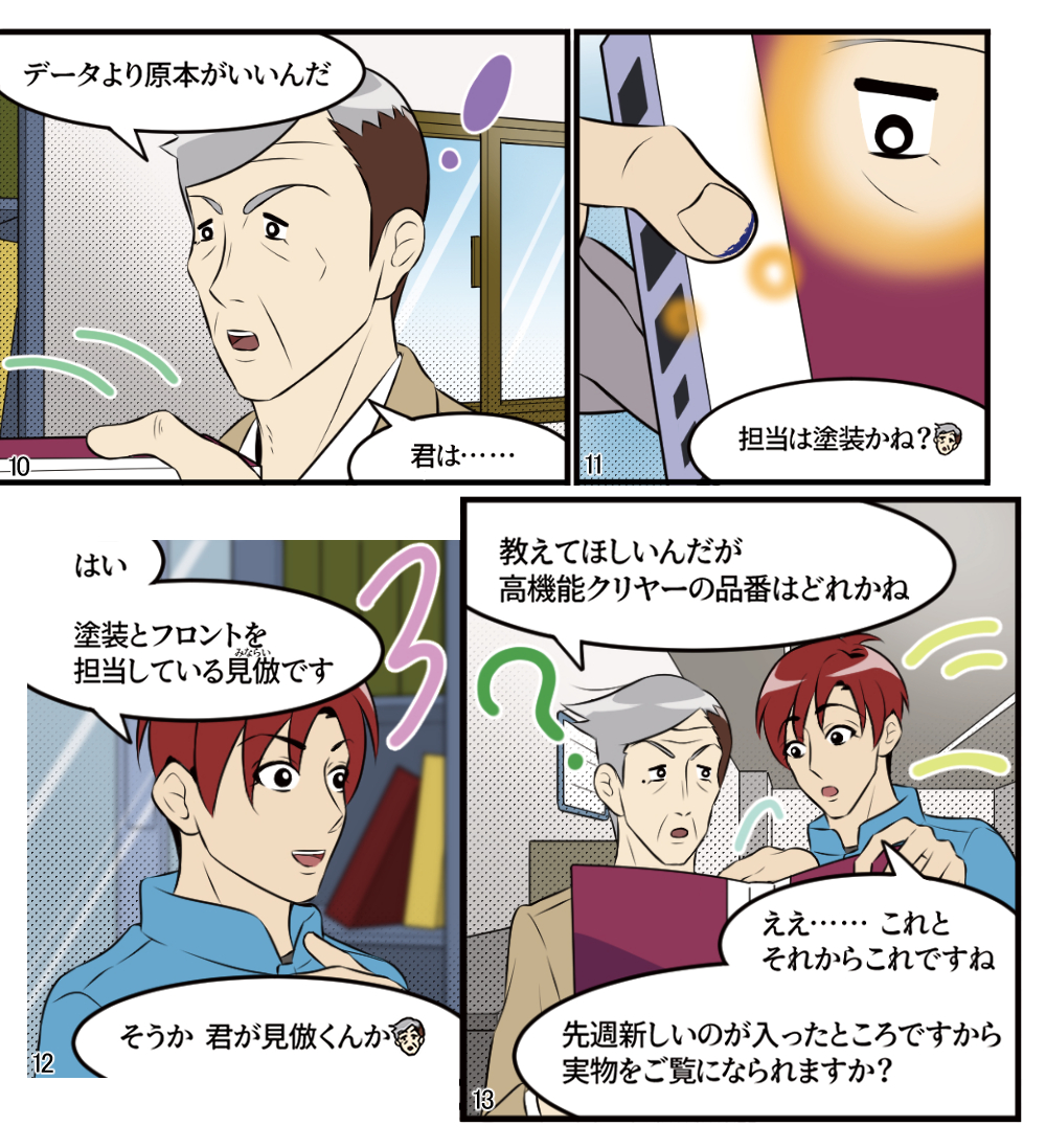 本稿は鈑金塗装業界に身を投じ、現場の作業を一通り知っている主人公らの視点から事故車見積りを学ぶ、実際の現場経験に則した物語である。