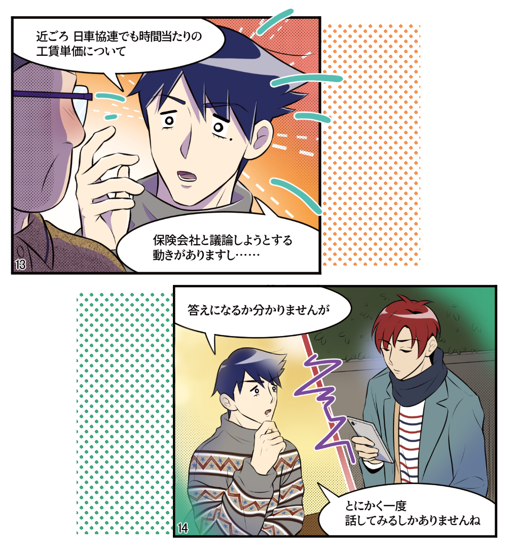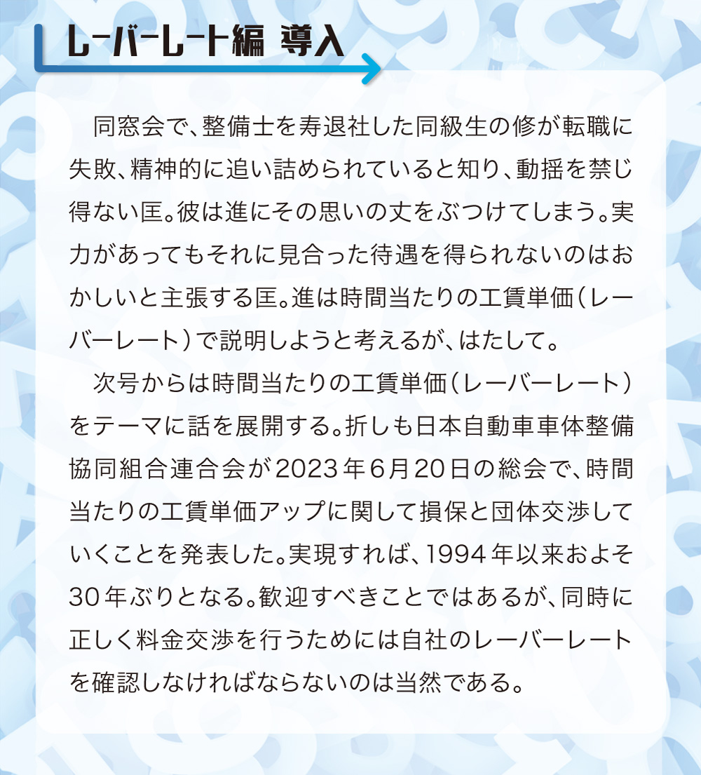 本稿は鈑金塗装業界に身を投じ、現場の作業を一通り知っている主人公らの視点から事故車見積りを学ぶ、実際の現場経験に則した物語である。