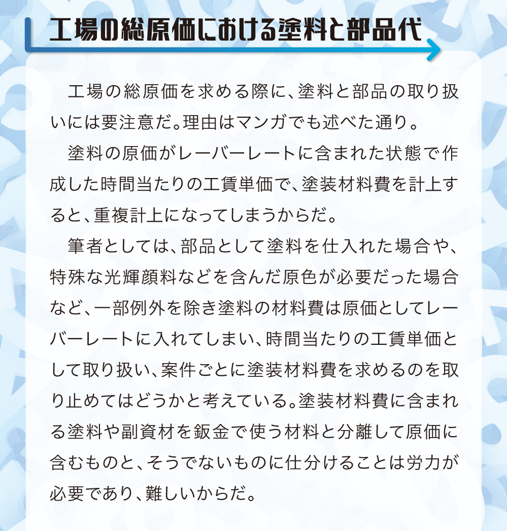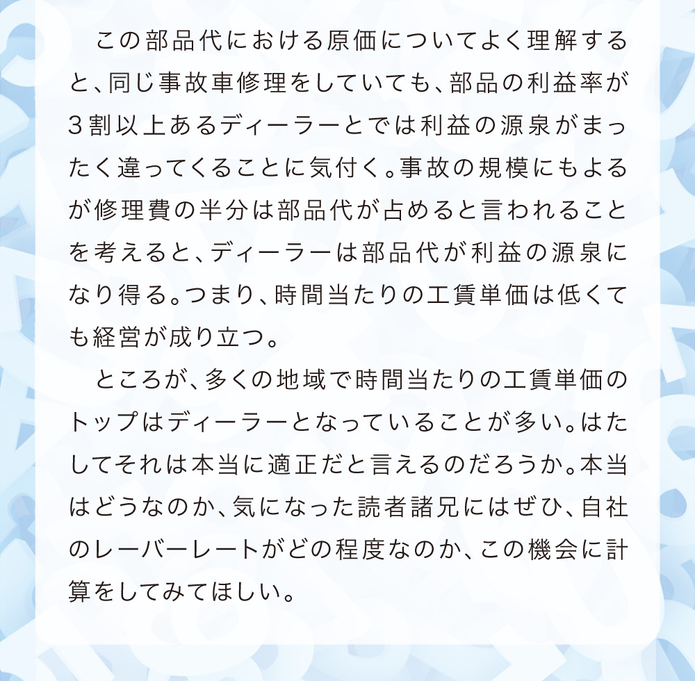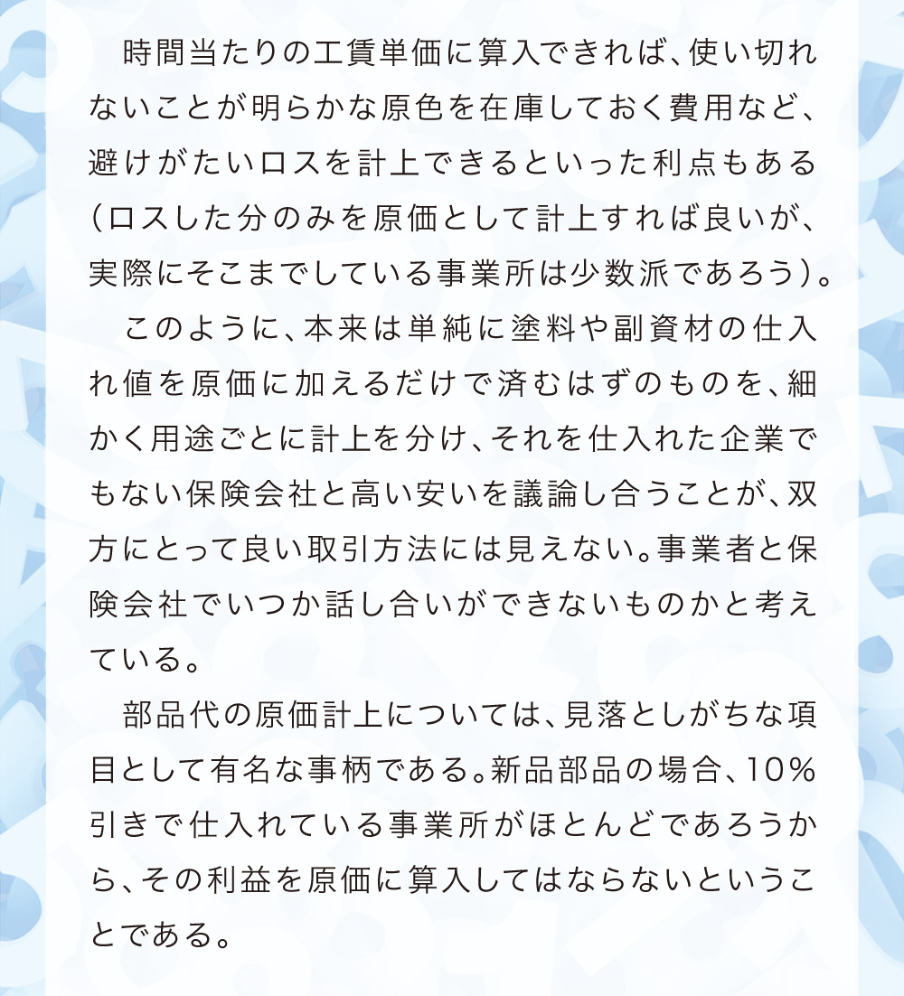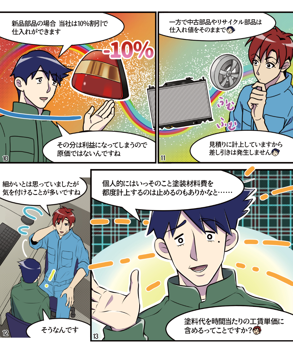 本稿は鈑金塗装業界に身を投じ、現場の作業を一通り知っている主人公らの視点から事故車見積りを学ぶ、実際の現場経験に則した物語である。