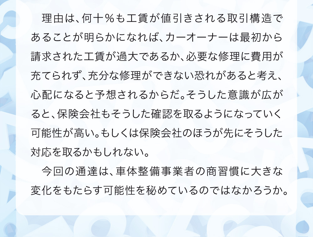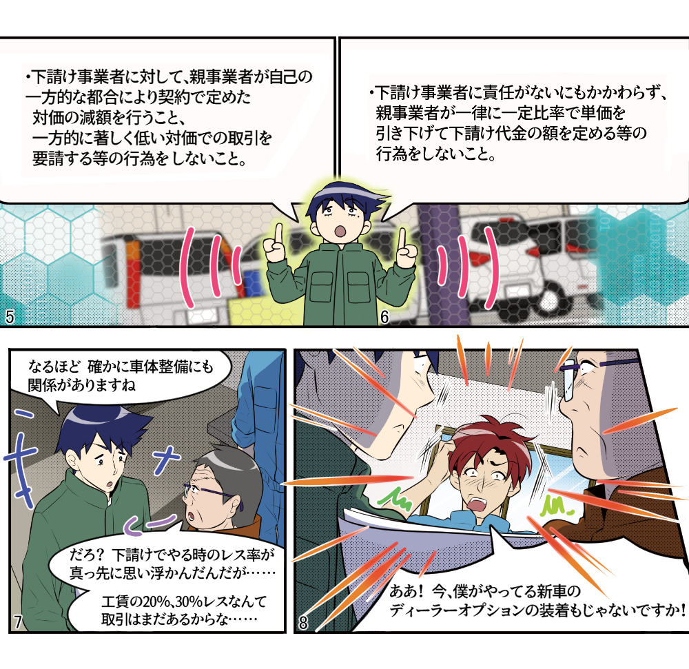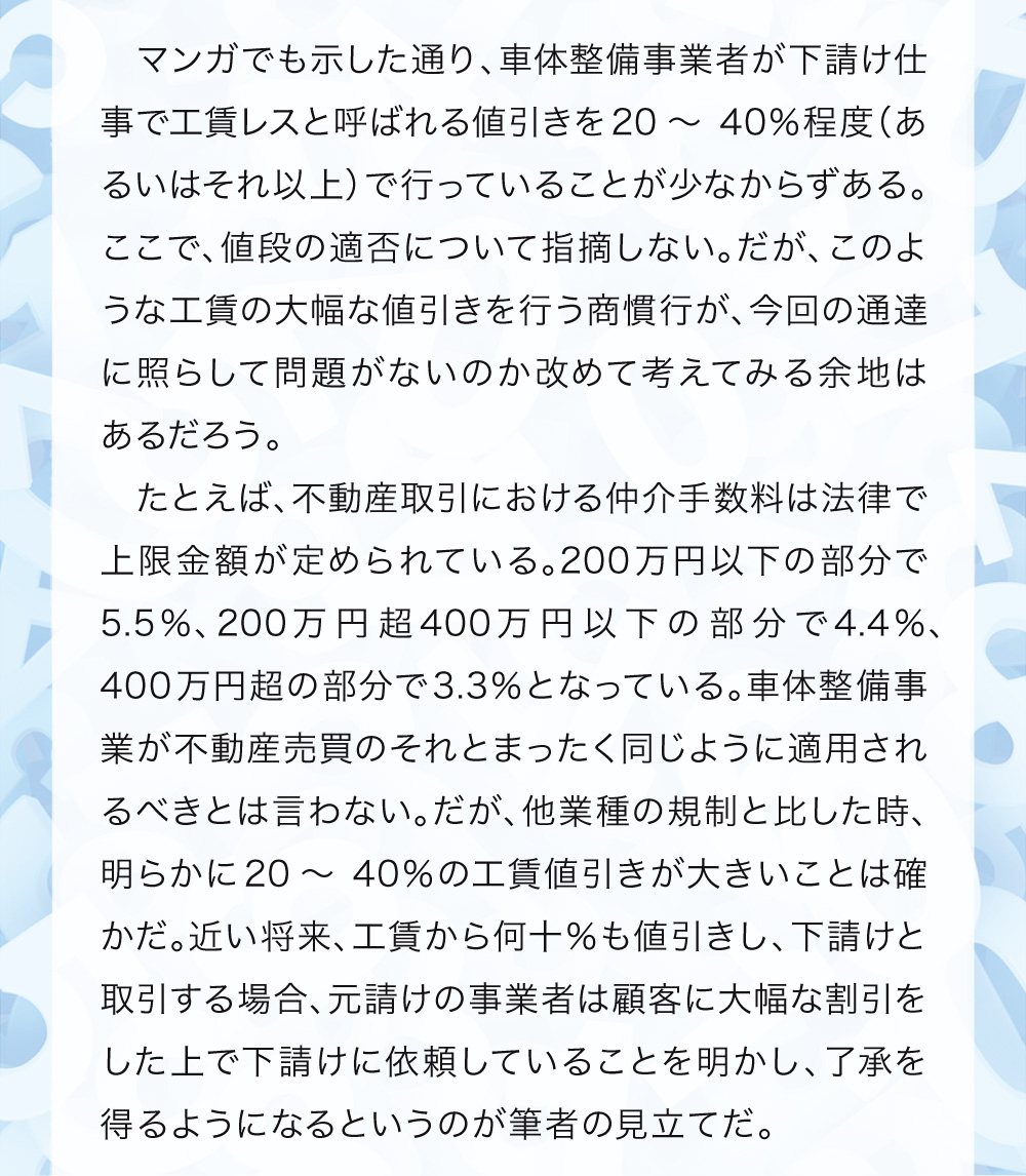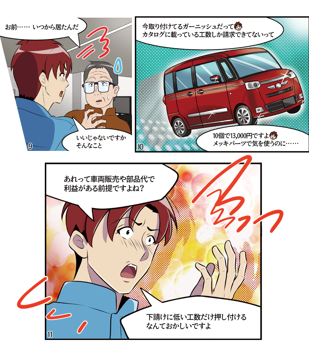 本稿は鈑金塗装業界に身を投じ、現場の作業を一通り知っている主人公らの視点から事故車見積りを学ぶ、実際の現場経験に則した物語である。