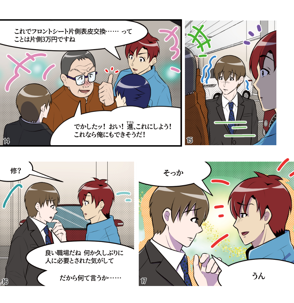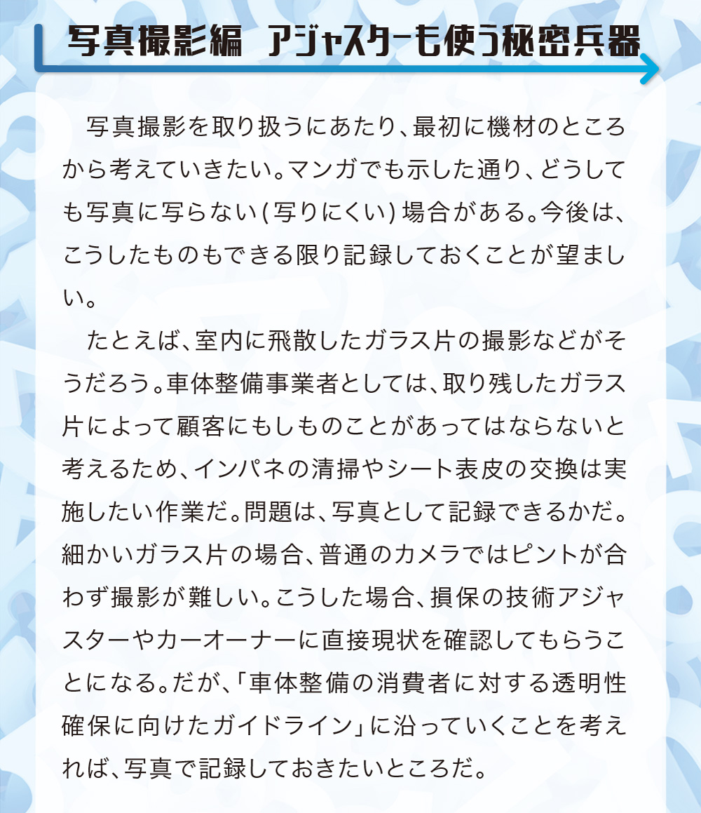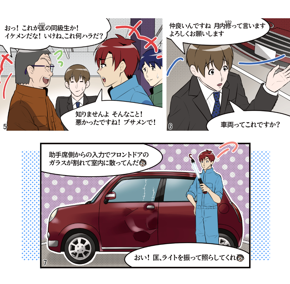 本稿は鈑金塗装業界に身を投じ、現場の作業を一通り知っている主人公らの視点から事故車見積りを学ぶ、実際の現場経験に則した物語である。