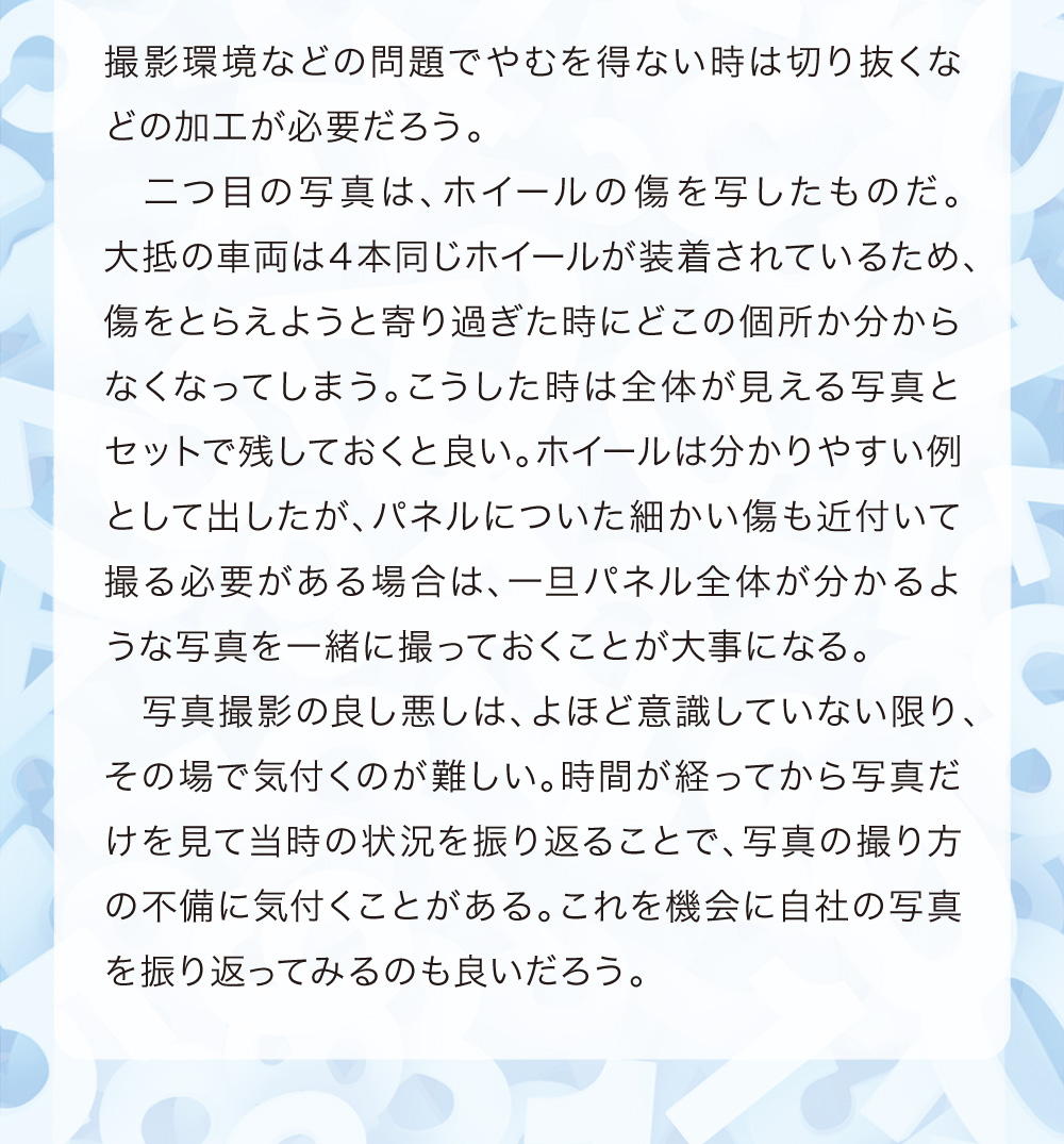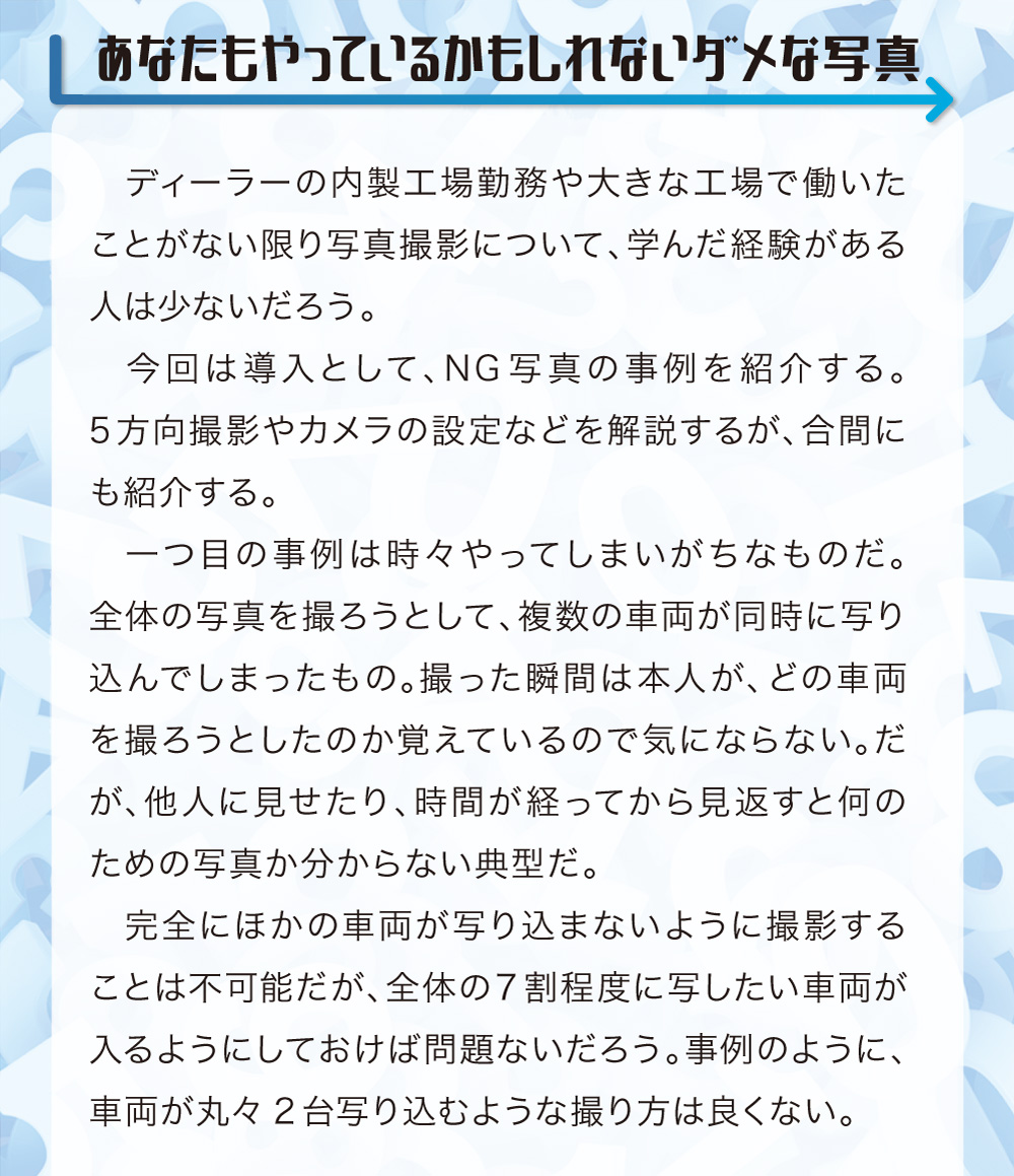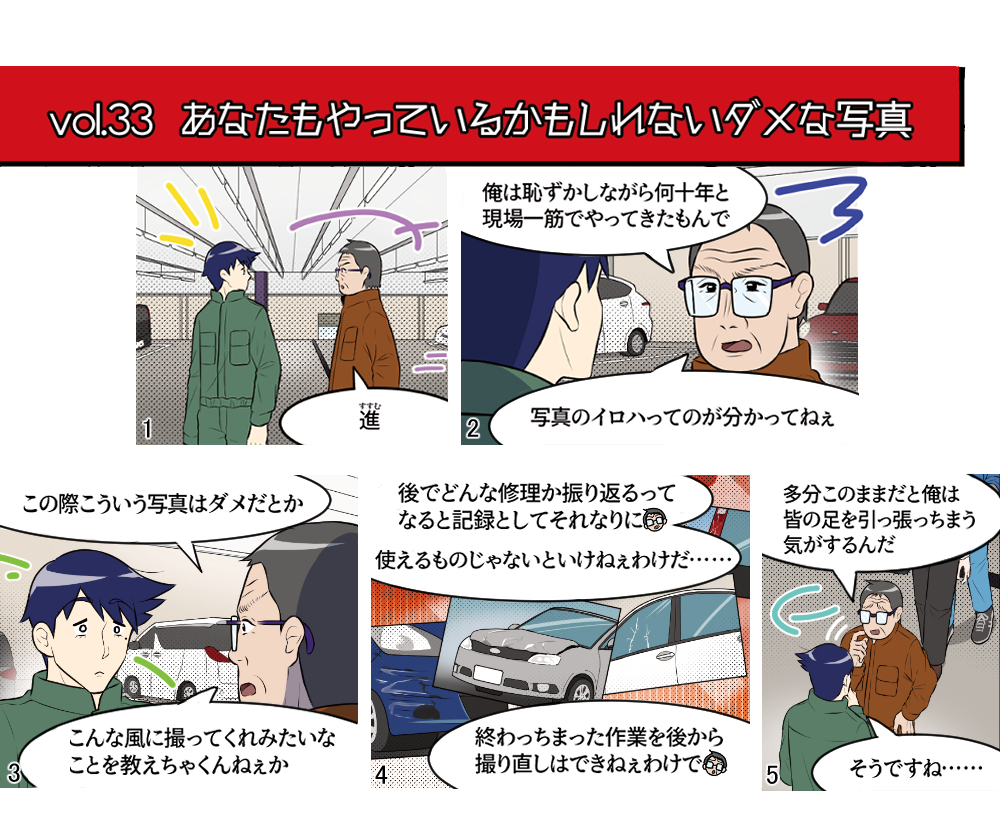 本稿は鈑金塗装業界に身を投じ、現場の作業を一通り知っている主人公らの視点から事故車見積りを学ぶ、実際の現場経験に則した物語である。